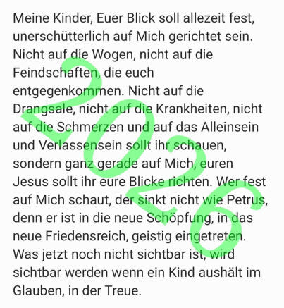 "Man wird euch keinen Glauben schenken, man wird alles Geistige als nebensächlich abtun, man wird euch verlachen und euch für Narren halten, die sich für eine unwahrscheinliche Sache einsetzen, man wird anzweifeln, was ihr von Meinem Geistwirken in euch ihnen kündet .... Die Menschen leben ohne Glauben dahin, und wo sie ihn noch zu besitzen behaupten, sind es nur Redensarten .... Der Glaube fehlt ihnen gänzlich, und es wird schwer sein, ihn wieder aufleben zu lassen, weil die Gedanken der Menschen selten geistig gerichtet sind, weil sie sich nicht befassen mit dem, was noch vor ihnen liegt, weil sie nur für das irdische Leben Interesse aufbringen und jeden als stillen Feind betrachten, der sie auf ihr Seelenleben aufmerksam macht." BD 5386